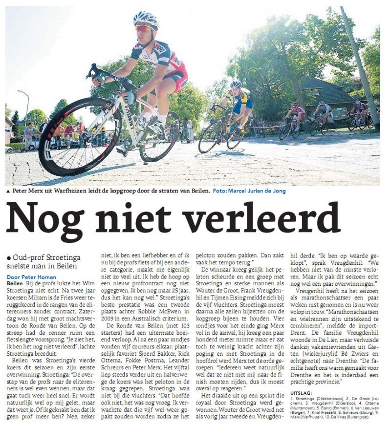 Voor Elim had ik iets meer geluk omdat ik dit keer wel wat meer in het midden mocht opstellen. Ik had voorspeld dat het gelijk op een lint zou komen, wat ook gebeurde. Ik reed gelijk naar voren en zag dat Leander Schreurs al weer weg was (op de 12). Ik reed er met Fokke Postma naar toe (kopie van de eerste ronden in Beilen haha) en na ons sloten nog 13 man aan zodat we met 16 man rondreden, waarvan 5 NWVG'ers. We reden vrij hard rond en al gauw dubbelden we verschillende groepen. Een kilometer of 40 voor het eind brak het in de kopgroep en ik moest even alle zeilen bijzetten om het recht te zetten en mezelf van voren te houden. Zo kwamen we met 10 man voorop te zitten, met Henrik Abom en ik als vertegenwoordigers van Groningen erbij. Ik besloot rustig te blijven en op mijn sprint te gokken omdat ik de inspanning van Beilen en de reis nog voelde. Ik ging als eerste de laatste bocht in maar op het stuk wind tegen naar de finish konden nog twee mannen mij voorbijsprinten waardoor ik derde werd.